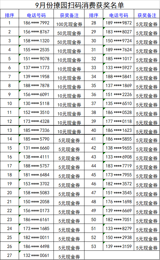 撩园APP9月份线上扫码支付获奖名单,共53人